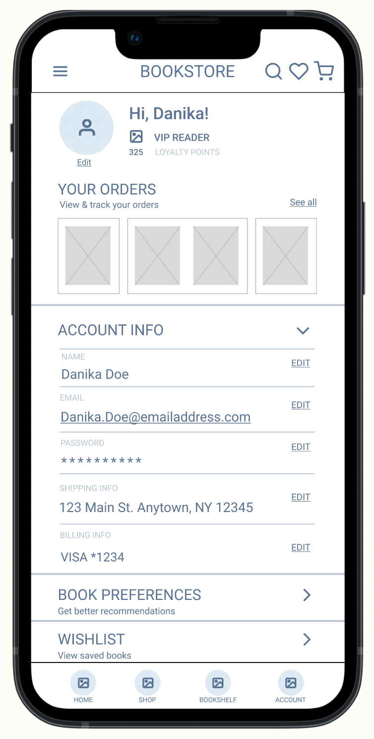 As I moved into digital wireframes, I brought in elements that would help users quickly discover new books since that was a key pain point from the user research.