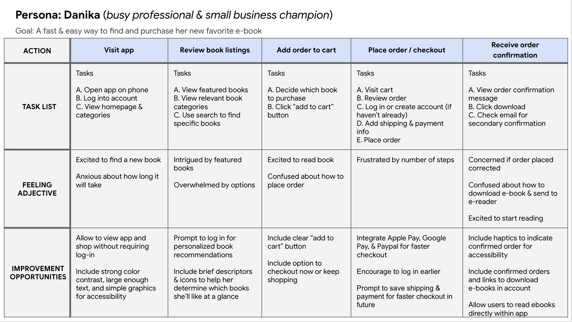 Mapping Danika’s user journey map revealed how helpful it would be for users to order and read e-books within one app.